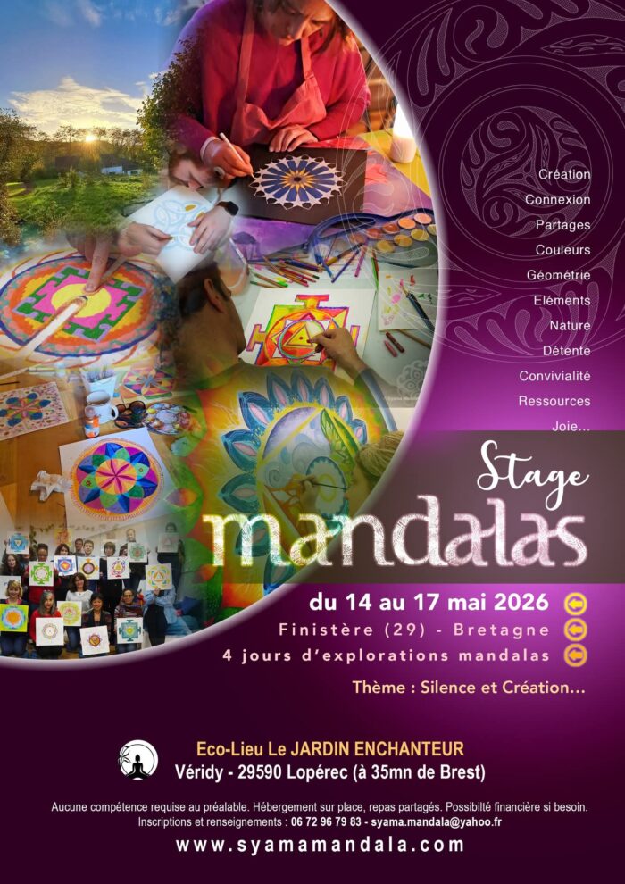 4 jours au cœur des éléments bretons, dans un gîte magnifique et d’une humble simplicité. 4 jours de pratique mandala, de couleurs, de relaxation et d’échanges pour avancer sur le chemin de votre mandala personnel et peut-être voir cet « outil » différemment.